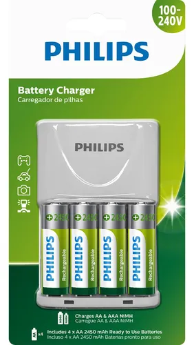 Carregador C/ 4 Pilhas Philips Recarregaveis Aa 2450mah