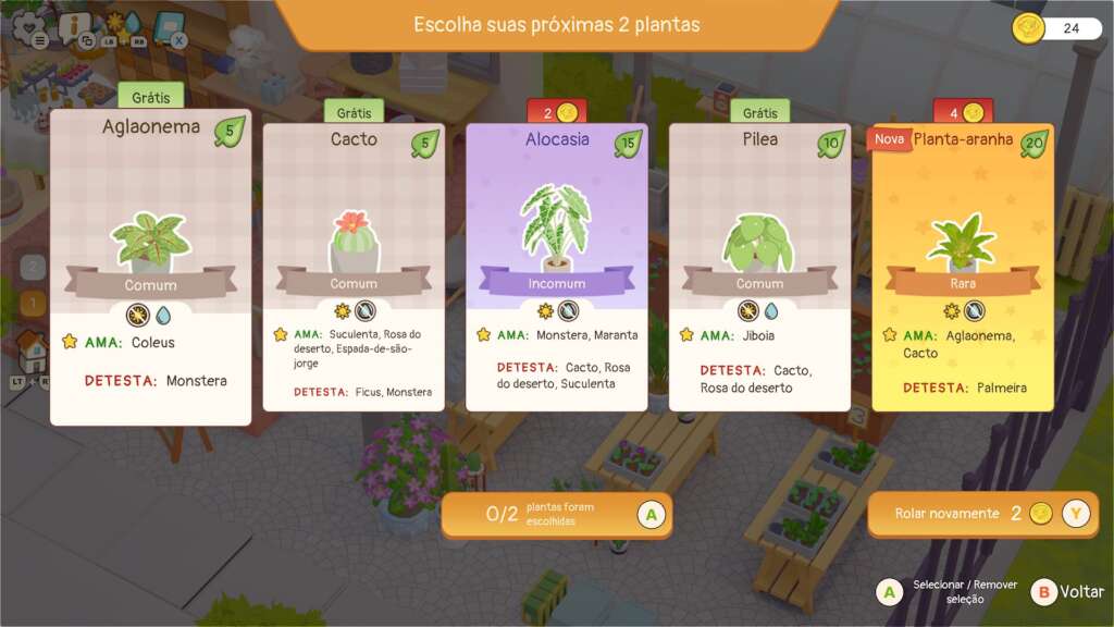 Você começa em ambientes frios, quase sem vida, e aos poucos transforma tudo em espaços vibrantes e cheios de identidade. O uso de cores, especialmente os tons de verde, cresce junto com o progresso.