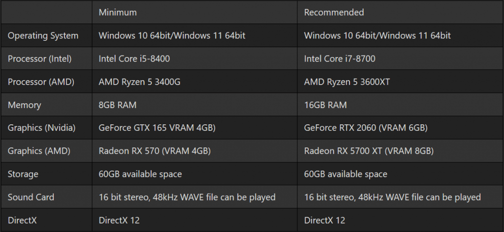 Se você está olhando para o game no PC, a Team Ninja recomenda as seguintes configurações. O mínimo tem como alvo 720p/30fps em um HDD com configurações gráficas de “Melhor Desempenho”, enquanto o Recomendado tem como alvo 1080p/60fps em um HDD com configurações gráficas “Padrão”. A equipe verificou que 4k/60fps com configurações gráficas ‘Padrão’ podem ser alcançados ao usar uma Nvidia GeForce RTX 3080 (VRAM 12GB).